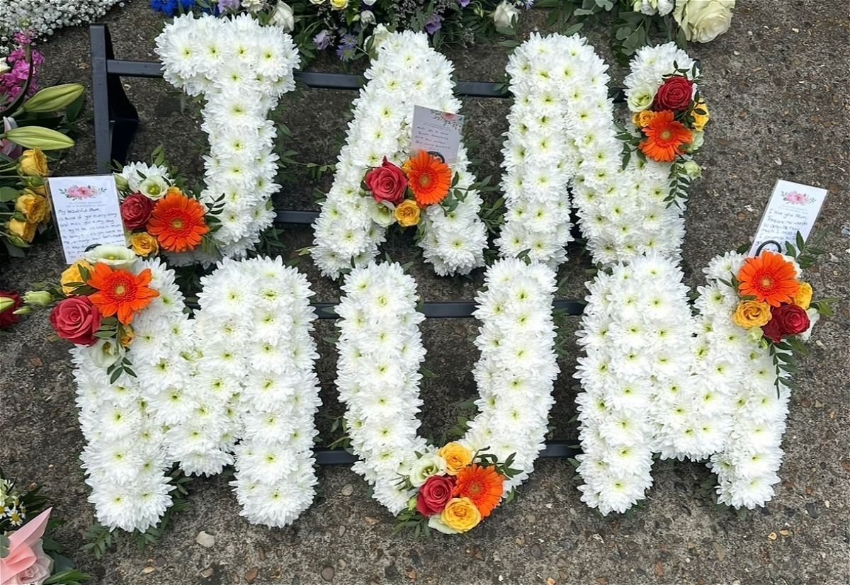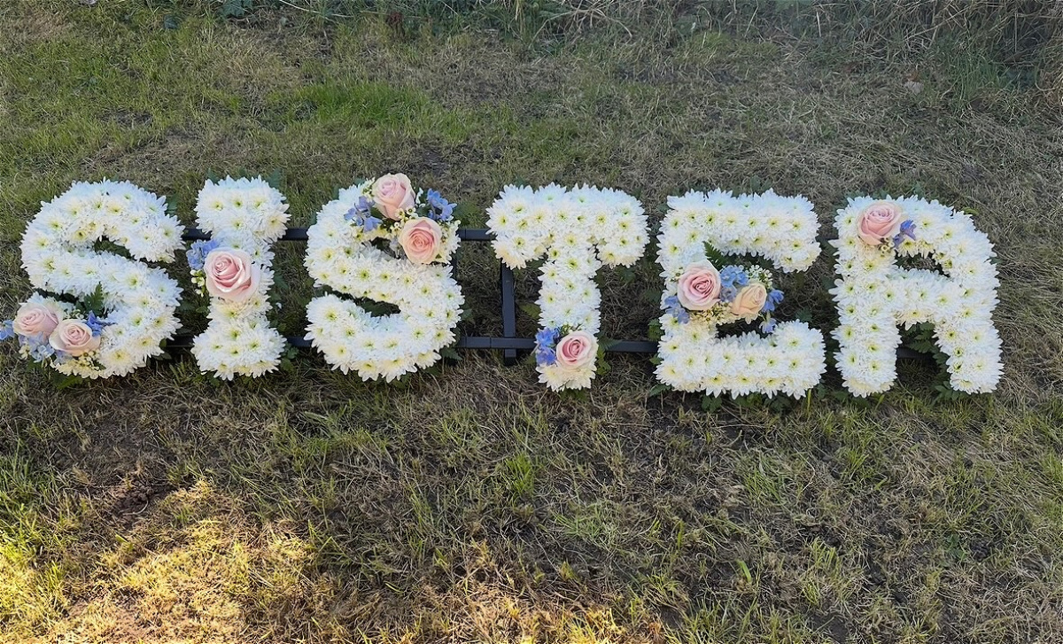 A white base of chrysanthemum with a spray of season flowers in your chosen colour scheme, with matching ribbon edge. If you would prefer a foliage edge, please leave a comment in the notes at checkout.