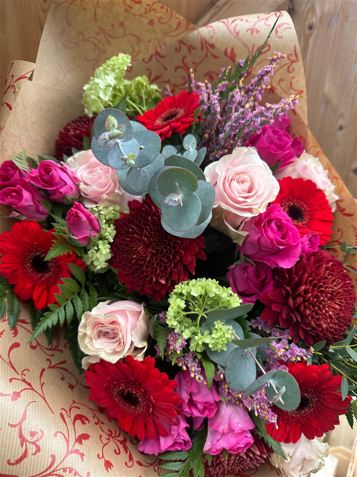 A mixture of reds, pinks and white seasonal flowers. The perfect bouquet for the non traditionalist and something a bit different to red roses